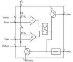 • The first comparator compares the threshold pin with 2/3 Vcc, while the second compares the trigger pin with 1/3 Vcc.