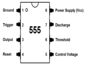 The 555 timer is packaged in an 8-pin Dual Inline Package (DIP). Each pin serves a unique function: