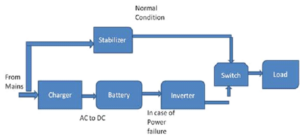 A UPS system stores electrical energy in batteries and provides backup power during a mains failure. Under normal conditions, the mains supply charges the batteries after passing through a stabilizer and rectifier circuit.