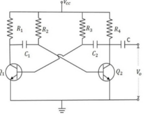 The emitters of both transistors are connected to ground. The collector load resistors (R1 and R4) and the base biasing resistors (R2 and R3) have equal values. Similarly, the capacitors C1 and C2 also have equal values.
