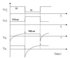 This process continues as capacitor C2 now charges through R3. When the base voltage of Q1 again reaches approximately +0.6 V, Q1 turns ON and Q2 turns OFF. The cycle then repeats, producing continuous oscillations.