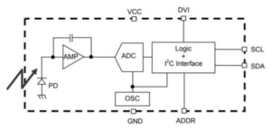 The OP-AMP converts the photodiode current into a voltage signal. This analog voltage is then converted into 16-bit digital data using an internal Analog-to-Digital Converter (ADC). The digital data is processed using internal logic and communicated through the I2C bus interface for ambient light calculation.
