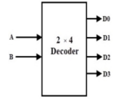 A 2-to-4 line binary decoder has three inputs — A0, A1, and E (Enable) — and four outputs — Y0, Y1, Y2, and Y3. When the enable input E is set to 1, one of the four outputs becomes high (logic 1) based on the binary input combination.