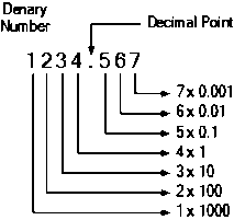 In the decimal (denary) number system, we use base-10, which means each digit can take one of ten values from 0 to 9. As we move from right to left, each digit becomes ten times larger than the digit to its right.
