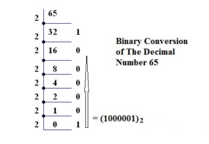 65 ÷ 2 = 32 remainder 1 32 ÷ 2 = 16 remainder 0 16 ÷ 2 = 8 remainder 0 8 ÷ 2 = 4 remainder 0 4 ÷ 2 = 2 remainder 0 2 ÷ 2 = 1 remainder 0 1 ÷ 2 = 0 remainder 1