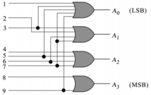 A Decimal to BCD (Binary Coded Decimal) Encoder converts decimal numbers (0–9) into their 4-bit binary equivalent.