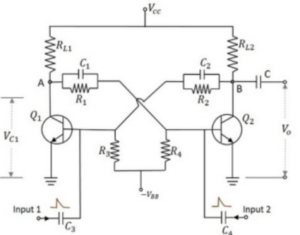 Unlike an astable multivibrator, this switching does not produce continuous oscillations. Instead, the circuit remains in one stable state until an external trigger changes it. The switching threshold depends on the passive components used in the regenerative feedback loop between the two transistors.