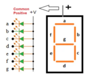 In a common cathode display, the cathodes of all seven LEDs are connected together and grounded (connected to -Vcc). Each segment’s anode terminal is connected separately to a current source. A segment lights up when a HIGH signal is applied to its anode.
