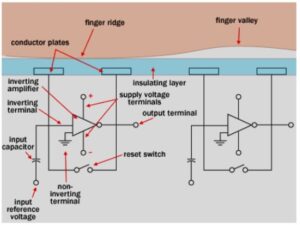 When a finger touches the sensor, the capacitance changes based on the distance between the skin and the sensor. These variations are used to create a highly accurate fingerprint image. Capacitive scanners are more secure and harder to deceive compared to optical scanners.