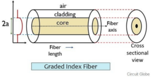 A graded-index (GRIN) fiber is an optical fiber whose core refractive index decreases gradually as the radial distance from the fiber’s central axis increases. This varying index profile causes light rays to follow sinusoidal paths along the fiber.