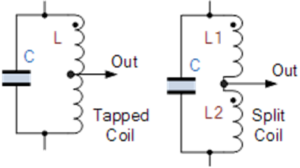 Because the coil L is center-tapped, the Hartley circuit is often called a split-inductance oscillator. When a current flows through coil section XY, it induces a signal in coil section YZ below, causing the total inductance L to act as two closely coupled coils. This configuration can be achieved using either a single tapped coil (similar to an autotransformer) or two series-connected coils in parallel with a single capacitor, as shown in typical Hartley oscillator circuits.