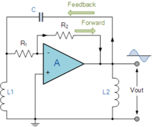 A Hartley oscillator can also be built using an operational amplifier (op-amp) as the active component. The key advantage of this configuration is the ease of adjusting the amplifier’s gain using the feedback resistors R1 and R2.