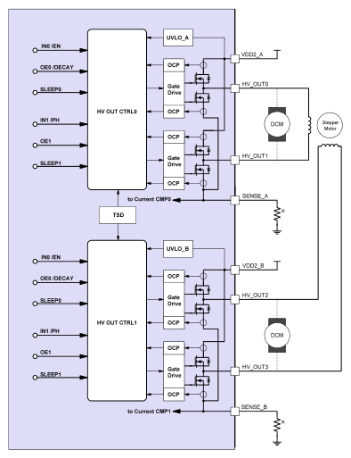 The current is sensed by external sense resistors connected to SENSE Pins. Special current comparators are used to convert these currents to a logic level. Using a current comparator with a PWM block, the output current can be dynamically changed. For example, for a stepper motor for micro-stepping, it is possible to set 16 values for the sinusoidal current limit form.