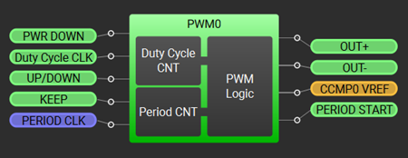 HVPAK ICs feature Pulse Width Modulator (PWM) blocks. PWM is commonly used in DC motor control, LED brightness control, and other applications.