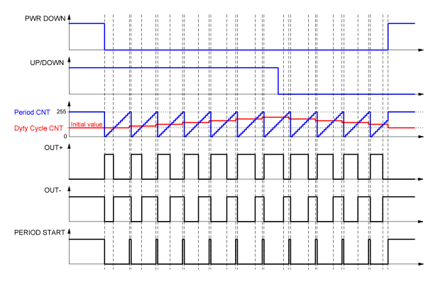 The PWM block consists of two 8-bit counters. The first one, named PWM Period CNT, is used to create a PWM period, and the second one, named Duty Cycle CNT, is used to set the PWM Duty Cycle and to make dynamic changes in the PWM functionality.