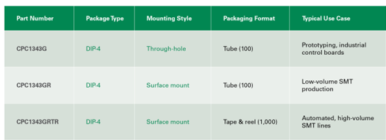 The CPC1343G is available in through-hole DIP-4 and surface-mount packages, including tape-and-reel options for automated, high-volume production.
