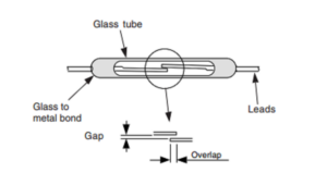 A reed switch consists of two thin ferromagnetic metal strips (reeds) enclosed in a sealed glass tube filled with inert gas.