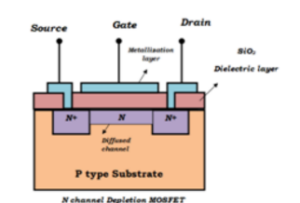 In an N-channel Depletion MOSFET, an N-type semiconductor strip connects the source and drain. The substrate is P-type. Current flows even without any gate voltage. Applying a negative gate voltage repels electrons, reducing the drain current, hence putting the MOSFET in depletion mode.