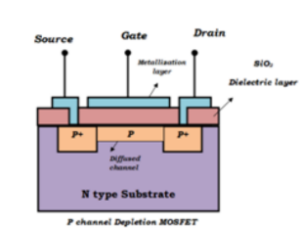 Here, a P-type semiconductor strip connects the source and drain. The substrate is N-type, and holes are the majority carriers. Applying a positive gate voltage reduces the current by repelling holes.