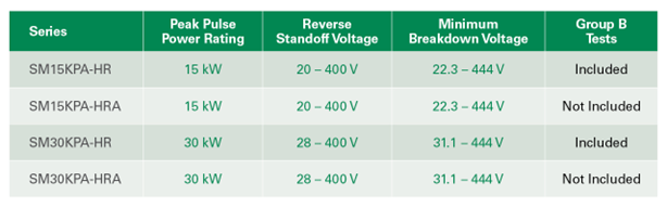The SM15KPA-HR/HRA and SM30KPA-HR/HRA Series TVS diodes are available in tape and reel format in quantities of 500. Sample requests are accepted through authorized Littelfuse distributors worldwide. For a listing of Littelfuse distributors, please visit Littelfuse.com.