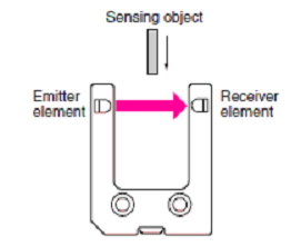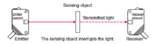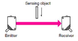 In Through-beam Sensors, the emitter and receiver are installed opposite each other. The emitted light travels directly to the receiver. When an object passes between them, it interrupts the light beam, reducing the light intensity received. This reduction is used to detect the object.