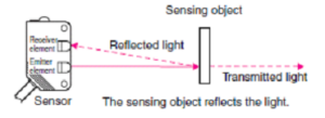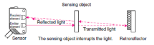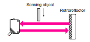 In Retro-reflective Sensors, the emitter and receiver are housed together, and a reflector is installed opposite the sensor. Light from the emitter reflects off the reflector and returns to the receiver. When an object interrupts the light beam, the received light intensity decreases, indicating object detection.