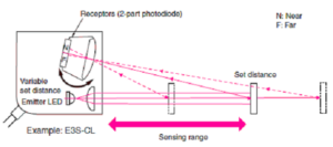 Distance-settable Sensors use a 2-part photodiode or position detector. The reflected light is focused onto the receiver. Based on the triangulation principle, the position of the focused light depends on the object’s distance.