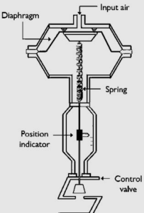 If the air pressure continues to increase, the diaphragm moves further downward until the valve is completely closed. When the air pressure decreases, the spring force becomes stronger than the air pressure, pushing the diaphragm upward and reopening the control valve. The position of the control valve is therefore controlled by air pressure. In automated systems, actuators receive signals from controllers that adjust the air pressure, allowing the actuator to perform the required action.
