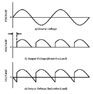• During the positive half cycle of the input, the forward-biased thyristors conduct and produce rectified DC.
