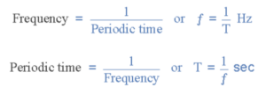 The time for one full cycle is called the period (T), and the number of cycles per second is the frequency (f). They are mathematically related as: