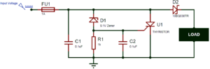 The over-voltage threshold is determined by the Zener diode value. The circuit includes an SCR (Silicon Controlled Rectifier) connected across the input voltage and ground. Normally, the SCR remains off as its gate is grounded. When the voltage exceeds the Zener breakdown voltage, the diode conducts, sending current to the SCR’s gate, which then short-circuits the supply and blows the fuse.