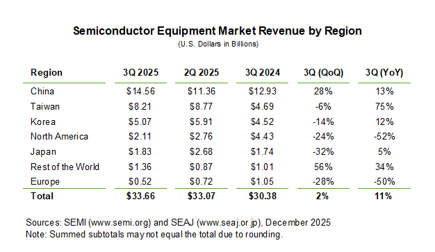 MILPITAS, Calif. – December 2, 2025 – SEMI, the industry association serving the global semiconductor and electronics design and manufacturing supply chain, today announced in its Worldwide Semiconductor Equipment Market Statistics (WWSEMS) Report that global semiconductor equipment billings increased 11% year-over-year to US$33.66 billion in the third quarter of 2025. Third quarter 2025 billings registered a 2% quarter-over-quarter growth.