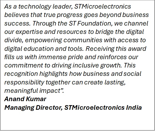 Chhavi Bajpai, STMicroelectronics IT Head and ST Foundation India Director shared her perspective during the panel discussion “an inclusive growth is possible and in ST, through our ST Foundation, we can create meaningful, lasting impact. We believe that digital inclusion is a cornerstone for sustainable development. The Digital Unify program exemplifies how targeted, community-driven efforts can transform lives and build resilient, empowered societies. This award reinforces our commitment to driving inclusive growth through technology and collaboration.”