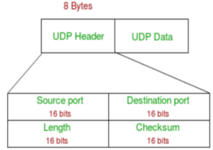 The UDP header is a fixed 8-byte structure, much smaller than the TCP header (20–60 bytes). Each port number field is 16 bits long and ranges from 0 to 65535. Port number 0 is reserved. These port numbers help identify specific processes.