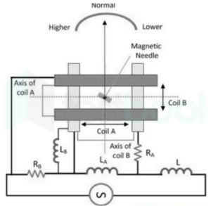 The magnetic axes of the two coils, A and B, are positioned perpendicular to each other. A long, thin soft-iron needle is placed at their center. The needle assembly includes a pointer and damping vanes but has no controlling device.